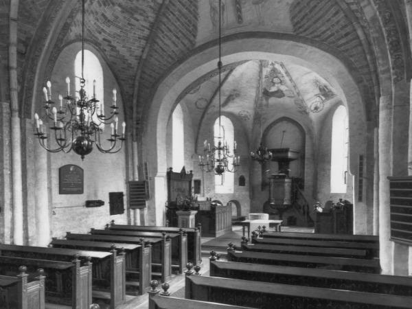 In de 14e eeuw werd het halfronde koor vervangen door een driezijdig gesloten gotisch koor met lancetvensters en versneden steunberen. De ruimte is, typerend voor het laatromaans, gedekt met meloenvormige koepelgewelven. Na de bouw werden in het koor figuratieve schilderingen aangebracht; Sebastiaan met de pijlen waarmee hij werd doorboord, Gregorius de Grote óf Fabianus – bronnen vermelden beide, maar door het kruis, het boek en de duif wijzen op Fabianus –, de kroning van Maria, de heilige Catharina met het rad, Christus met de symbolen van de vier evangelisten en Maria met het Christuskind.